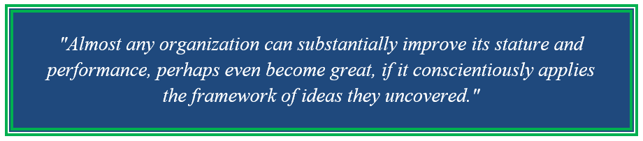 Key Findings. The research team discovered many lessons along the way, but one "giant conclusion" stood above the others. Their research confirmed that "almost any organization can substantially improve its stature and performance, perhaps even become great, if it conscientiously applies the framework of ideas they [the Collins team] uncovered." Additional lessons learned from the companies that went from good to great: