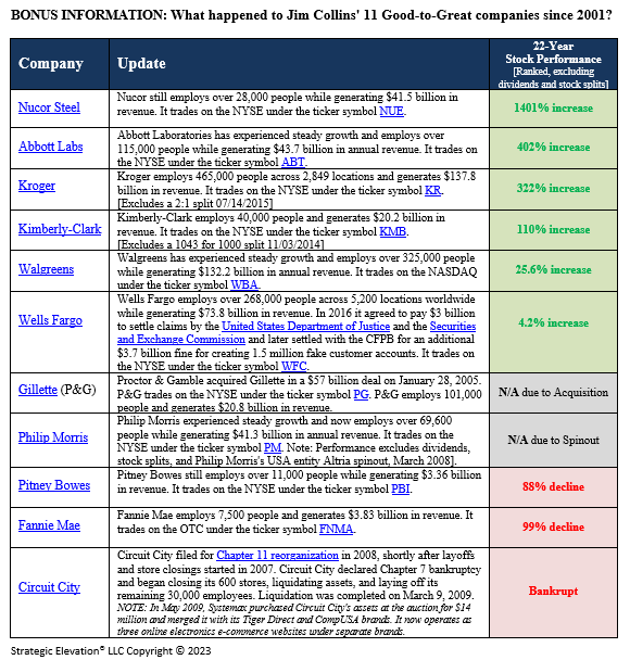 11 Featured Companies. Collins' team established technical search criteria to identify a group of companies from the Fortune 500 from 1965-1995 that consistently outperformed their peers and the overall market over a sustained (15-year) period. This group of featured companies included: Abbott Labs, Circuit City, Fannie Mae, Gillette, Kimberly-Clark, Kroger, Nucor Steel, Philip Morris, Pitney Bowes, Walgreens, and Wells Fargo.